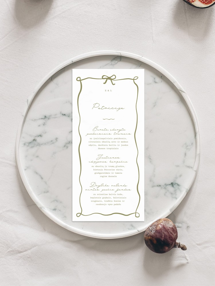 Įrašykite visų šventės dalyvių vardus, jaunųjų inicialus ir patiekalų pasirinkimus.